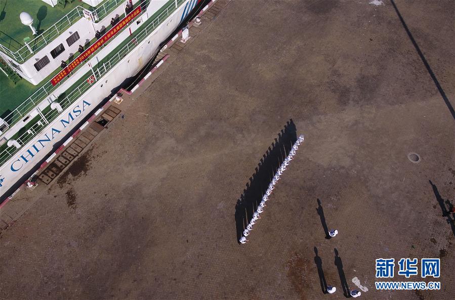 11月3日,海事執(zhí)法人員準(zhǔn)備登上“海巡21”輪(無(wú)人機(jī)拍攝)。當(dāng)日,隨著“海巡21”輪緩緩駛離??诤J卤O(jiān)管基地碼頭,由瓊桂粵海事部門共同開(kāi)展的瓊州海峽、北部灣及環(huán)海南島水域跨轄區(qū)聯(lián)合巡航執(zhí)法活動(dòng)揭開(kāi)序幕。新華社記者楊冠宇攝