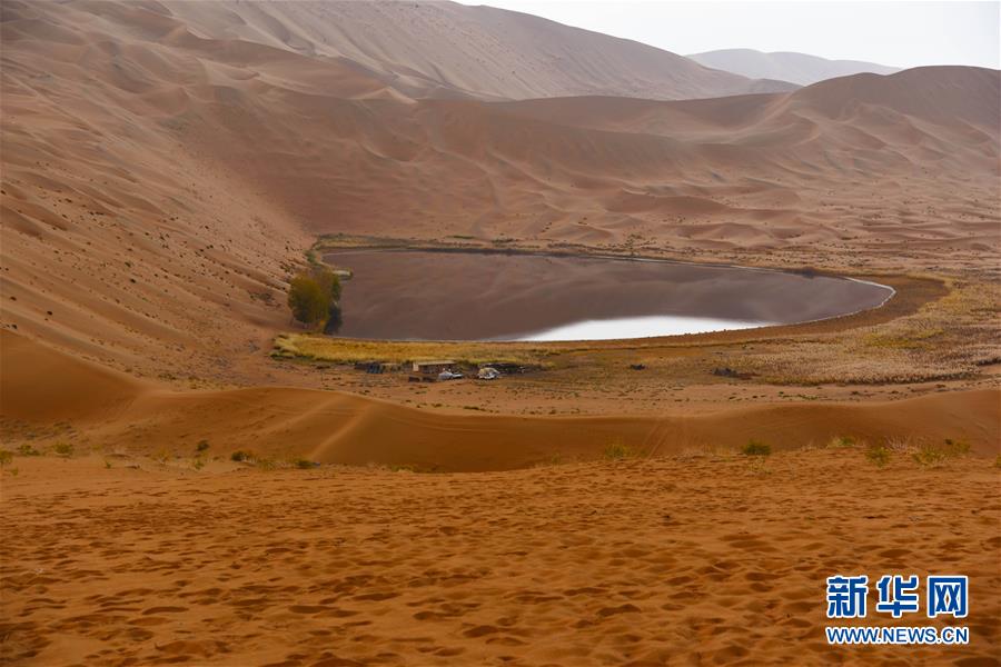 陰雨中的沙漠湖泊,常常讓人以為是一面鏡子(10月18日攝)。巴丹吉林沙漠位于內(nèi)蒙古西部阿拉善盟,是中國第三大沙漠,沙丘起伏的曲線陡變成高聳的沙山,碧藍(lán)的湖泊散落在沙海間。新華社記者李仁虎攝