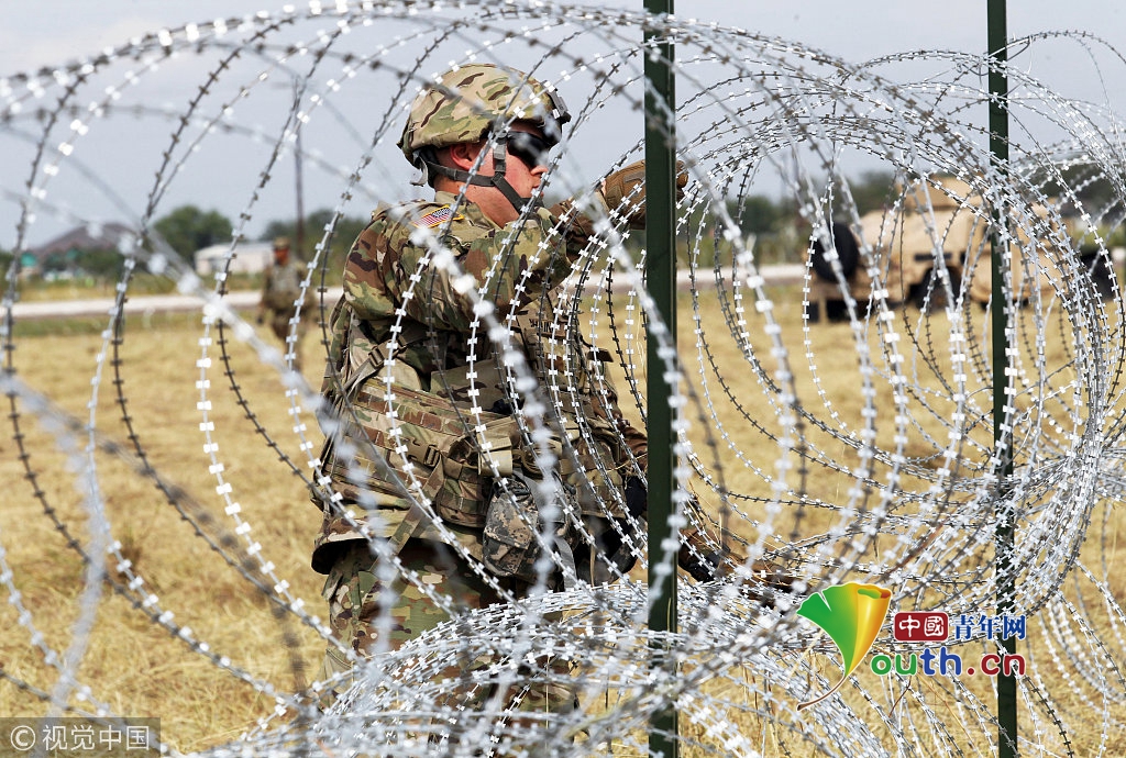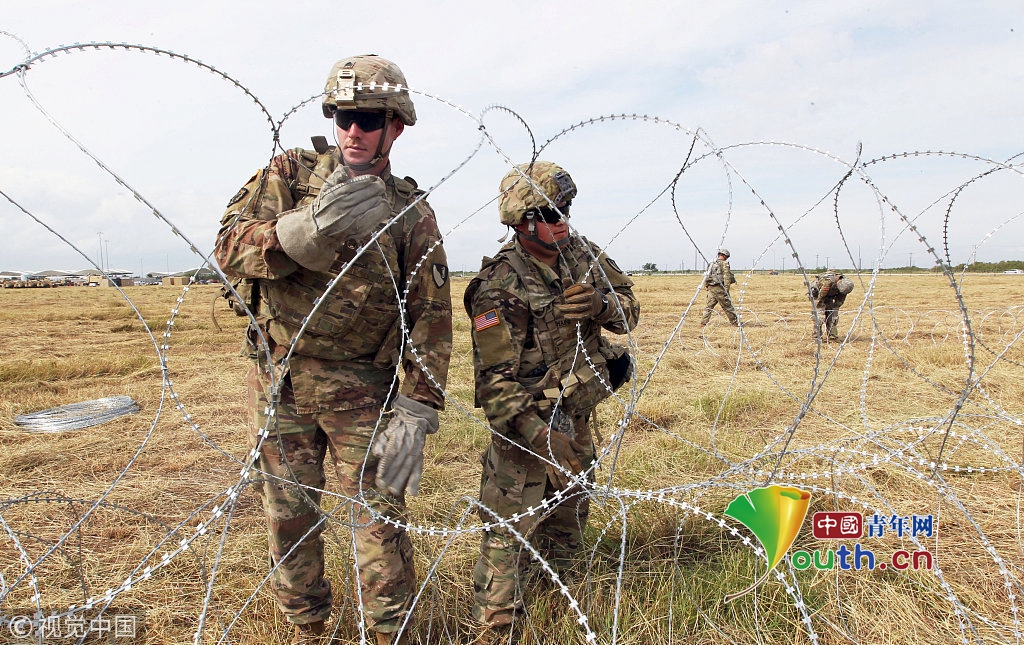 美國(guó)士兵部署美墨邊境點(diǎn),鋪設(shè)鐵絲網(wǎng)應(yīng)對(duì)移民大軍壓境。