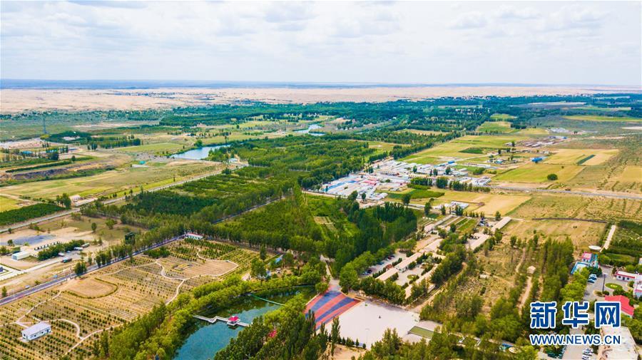 地處庫布其沙漠的恩格貝景區(qū)(6月8日無人機(jī)拍攝)。
