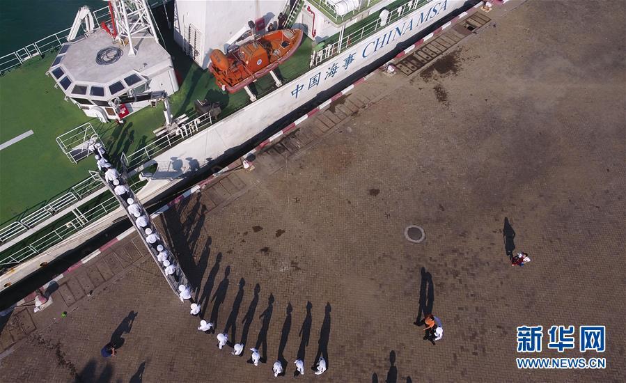 11月3日,海事執(zhí)法人員登上“海巡21”輪(無(wú)人機(jī)拍攝)。 當(dāng)日,隨著“海巡21”輪緩緩駛離??诤J卤O(jiān)管基地碼頭,由瓊桂粵海事部門共同開(kāi)展的瓊州海峽、北部灣及環(huán)海南島水域跨轄區(qū)聯(lián)合巡航執(zhí)法活動(dòng)揭開(kāi)序幕。 新華社記者楊冠宇攝