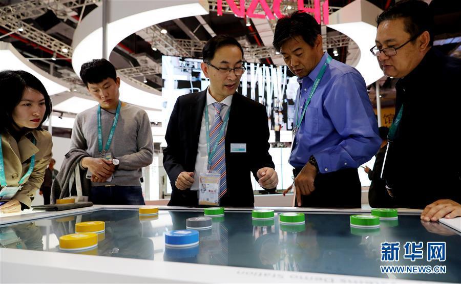11月5日,一名工作人員在歐姆龍展臺(tái)演示與機(jī)器人進(jìn)行乒乓球?qū)?zhàn)。新華社記者 方喆 攝