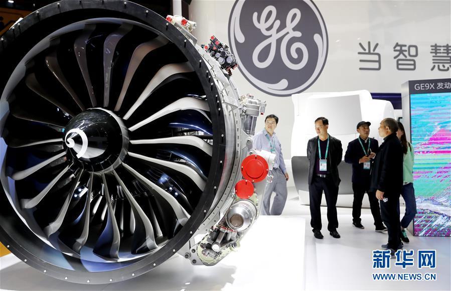11月5日,參觀者在美國通用電氣公司生產(chǎn)的飛機(jī)發(fā)動(dòng)機(jī)模型旁駐足。