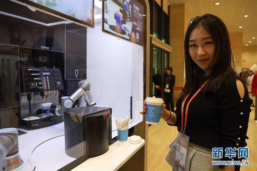 11月4日,一位媒體記者在首屆中國國際進(jìn)口博覽會(huì)新聞中心無人咖啡亭品嘗咖啡。 新華社記者 劉大偉 攝