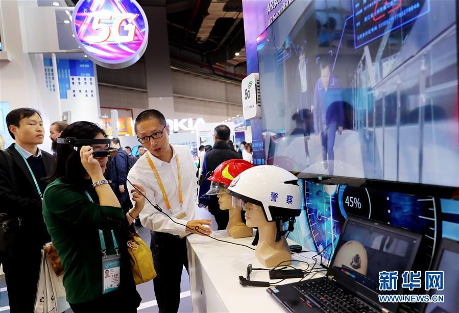 11月5日,一名參觀者(左)在諾基亞展臺(tái)體驗(yàn)一款基于5G通信技術(shù)的AR安防系統(tǒng)終端設(shè)備。 新華社記者 方喆 攝