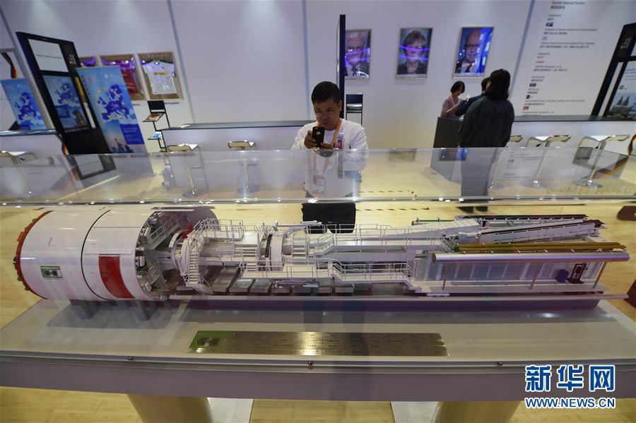 11月5日,一名參觀者在德國(guó)展館內(nèi)拍攝雙護(hù)盾盾構(gòu)機(jī)模型。 新華社記者 韓瑜慶 攝