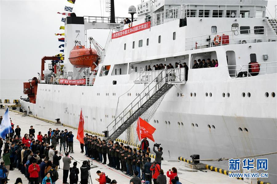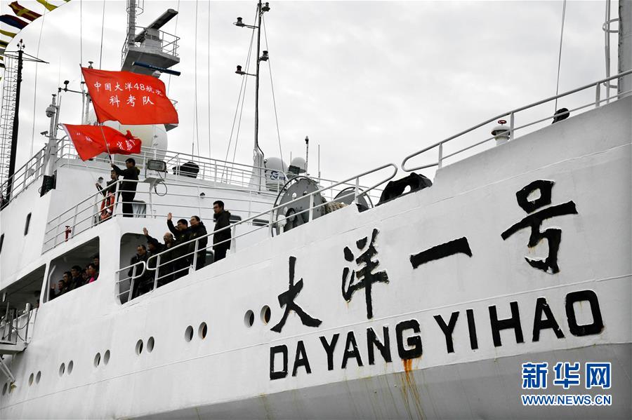 11月7日,科考隊(duì)員在“大洋一號(hào)”上向前來迎接的人群揮手致意。 新華社記者 李紫恒 攝