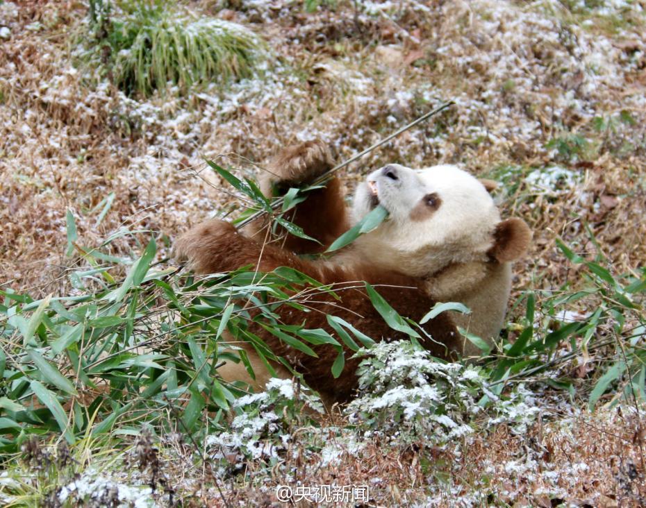 秦嶺大熊貓野化培訓(xùn)佛坪基地,7歲的棕色大熊貓七仔是目前全世界唯一能看到的棕色大熊貓活體。今年是它在基地過的第二個(gè)冬天,每逢下雪,七仔就興奮地滿園子跑,變身“雪花熊”。央視記者李志 王志杰 圖片來源:央視新聞官方微博
