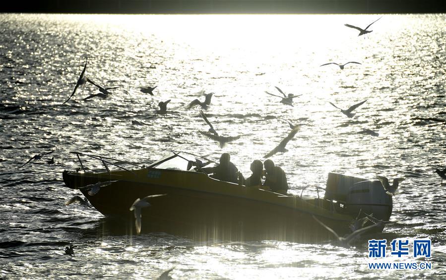 11月14日,人們?cè)诶ッ鞯岢厣铣俗未c紅嘴鷗嬉戲。 新華社記者 藺以光 攝