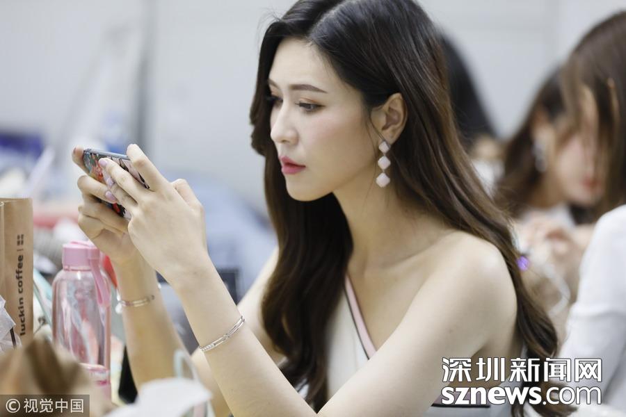 2018年11月16日,廣州,第十六屆中國(廣州)國際汽車展覽會媒體日。模特候場表演間隙,陳宏偉玩手機游戲