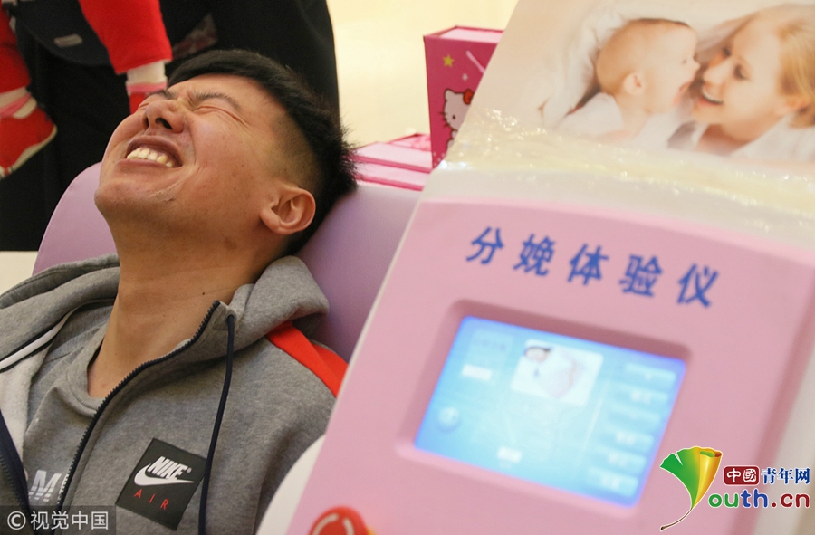 2018年3月8日,一名男士在山東煙臺(tái)大悅城通過“分娩體驗(yàn)儀”感受“分娩”時(shí)的陣痛。