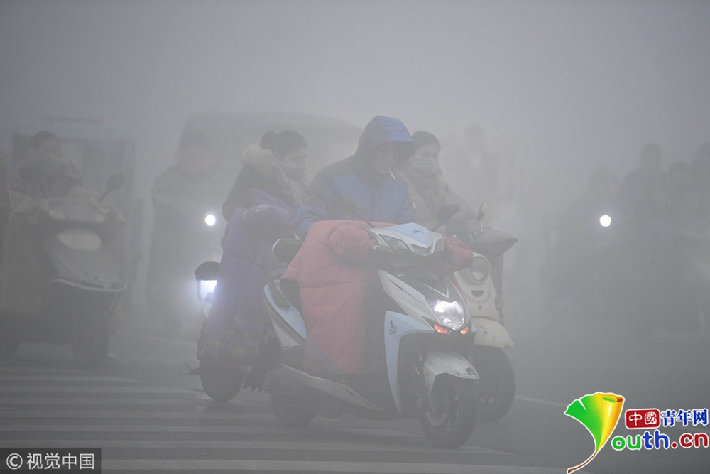 2018年11月26日,全國(guó)多地出現(xiàn)大霧天氣。安徽亳州,市民在大霧彌漫的街頭出行。
