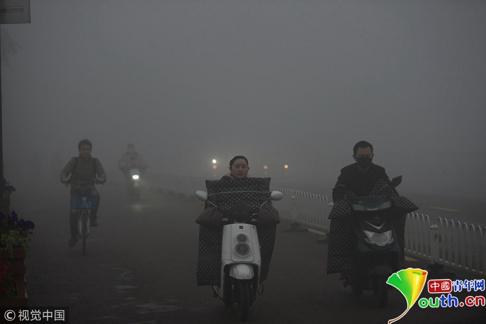 全國多地出現(xiàn)大霧天氣 市民霧中穿行