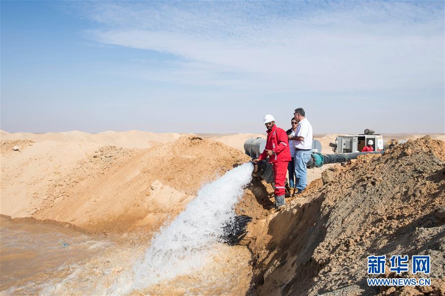 11月21日,在埃及明亞省,地下水從水管里噴涌而出。 2017年,中國中曼石油公司與阿聯(lián)酋海灣集團簽訂合同,為該集團在埃及沙漠中的大型農(nóng)業(yè)項目鉆探300口水井。根據(jù)合同,中曼石油將先期完成30口井的試鉆探,剩余水井將以每月7口的速度交付。目前有超過200名工人在鉆井現(xiàn)場作業(yè),大部分是埃及本地人。 新華社記者李碧念攝