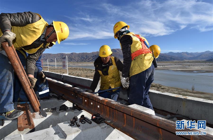 中鐵十一局的工人在川藏鐵路拉林段昌果特大橋進(jìn)行鋪軌作業(yè)(10月16日攝)。 近日,川藏鐵路拉薩至林芝段昌果特大橋開始鋪設(shè)行軌排、架設(shè)梁片,標(biāo)志著川藏鐵路拉林段正式進(jìn)入鋪軌階段。 新華社記者 普布扎西 攝