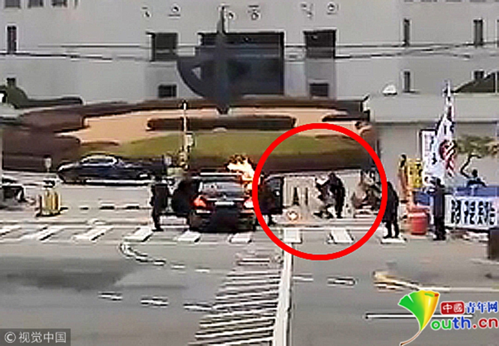 當(dāng)?shù)貢r(shí)間2018年11月27日,韓國首爾,27日上午9點(diǎn)10分,在首爾瑞草區(qū)的最高法院前面,一名74歲的示威男子向韓國最高法院院長金明秀所乘的車輛投擲燃燒瓶。副駕駛一側(cè)的前輪和示威男子身上均起火,所幸被現(xiàn)場警察迅速撲滅,金明秀未受傷。當(dāng)時(shí),他正準(zhǔn)備去上班。