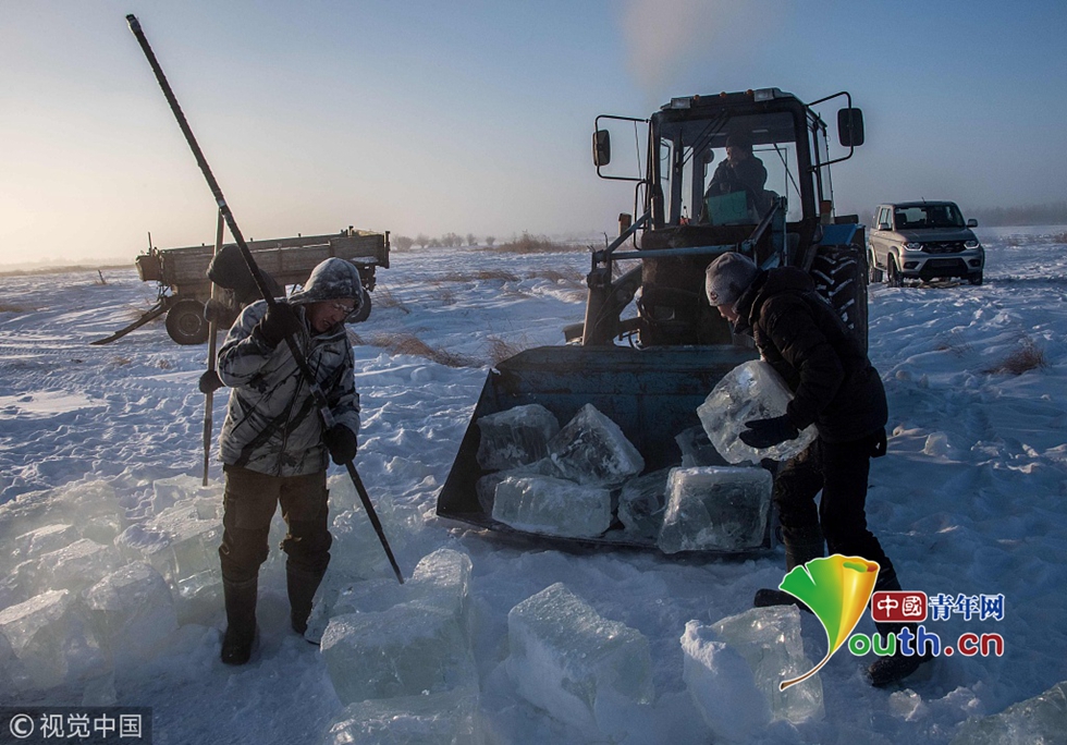 當?shù)貢r間2018年11月27日,雅庫茨克,零下41攝氏度左右的氣溫下,村民在當?shù)氐囊粋€湖中采集冰塊。當?shù)睾芏嗳艘蕾囉谌诨鶋K解決供水,因為多年凍土覆蓋地區(qū)冬季氣溫極低,沒有其他的方式供應水。
