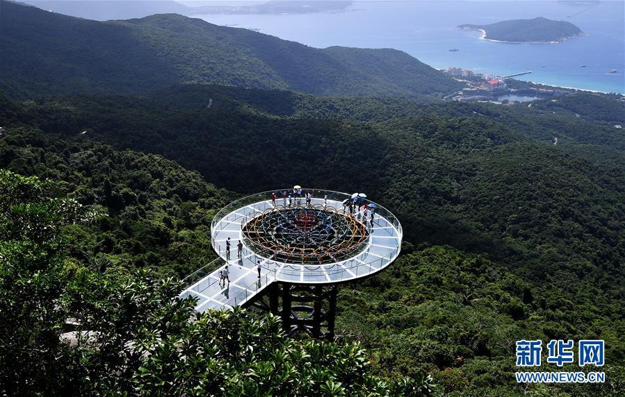 8月31日,游客在玻璃觀景平臺(tái)上參觀游覽。近日,位于海南省三亞市亞龍灣熱帶天堂森林公園的大佛石全海景玻璃棧道開(kāi)始正式營(yíng)業(yè)。凌空而建的玻璃棧道全長(zhǎng)400米,游客可將亞龍灣的美景盡收眼底。新華社記者郭程攝