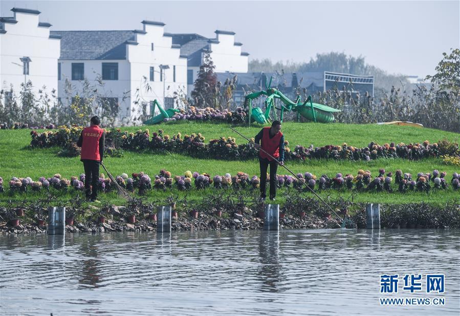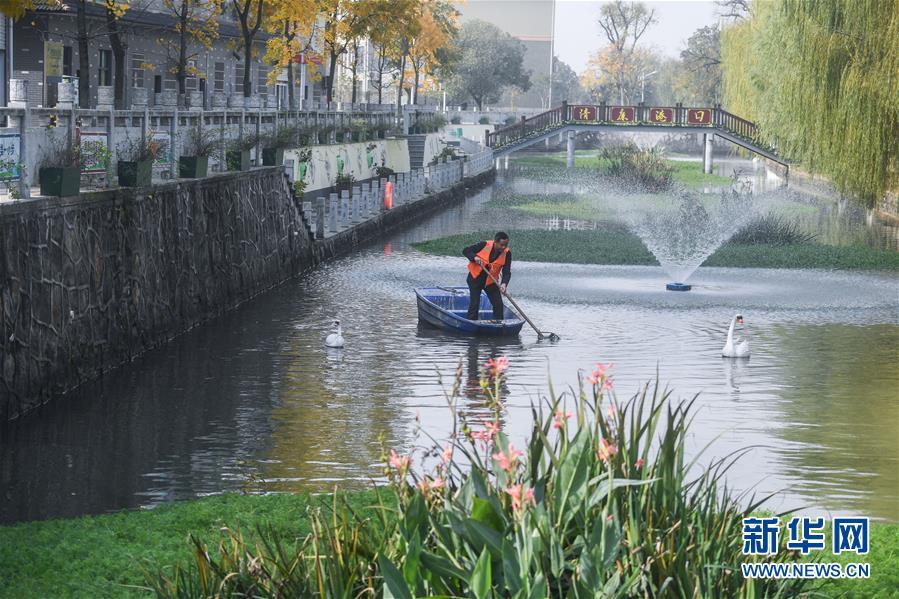 11月28日,林城鎮(zhèn)北湯村河長(zhǎng)黃雙喜(右)在施家邊河打撈水面漂浮物。近年來(lái),北湯村全面推進(jìn)“五水共治”,停止河道內(nèi)的水產(chǎn)養(yǎng)殖,并進(jìn)行河道清淤,整治周邊環(huán)境,另外還結(jié)合北湯生態(tài)園旅游項(xiàng)目,發(fā)展旅游經(jīng)濟(jì),打造水上娛樂(lè)設(shè)施。現(xiàn)在北湯村施家邊河道水質(zhì)清澈,環(huán)境秀美,每年為北湯村吸引游客18萬(wàn)人次。 新華社記者 徐昱 攝
