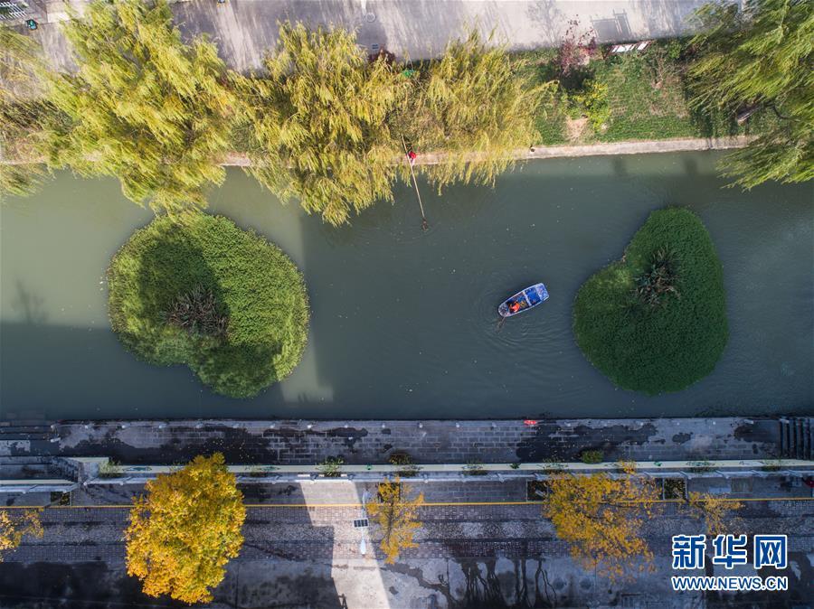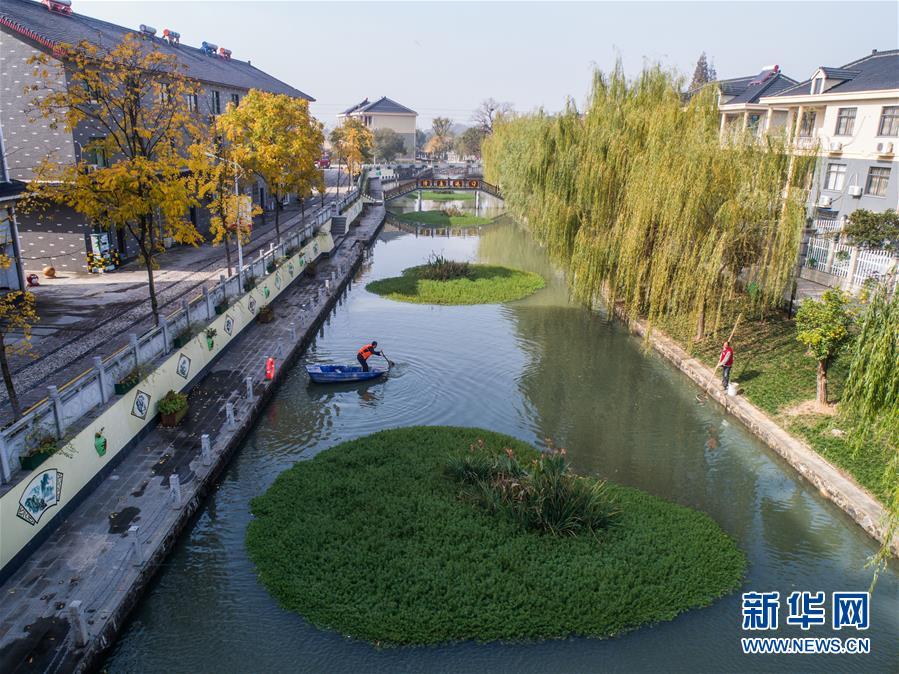 11月28日,長(zhǎng)興縣虹星橋鎮(zhèn)港口村東港內(nèi),工作人員在打撈水面漂浮物(無(wú)人機(jī)拍攝)。東港全長(zhǎng)1500米,環(huán)繞港口新村。2012年,新村建成后,港口村通過(guò)加固河岸、清理河道、種植浮草等方式對(duì)東港進(jìn)行生態(tài)治理,并由該村黨總支書(shū)記孫根法擔(dān)任河長(zhǎng),定期開(kāi)展巡查,引導(dǎo)村民自覺(jué)維護(hù)河道整潔。 新華社記者 徐昱 攝
