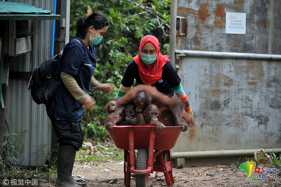 當(dāng)?shù)貢r(shí)間2018年9月18日,印尼加里曼丹克塔邦,國(guó)際動(dòng)物救援(IAR)猩猩安全與保護(hù)中心里,飼養(yǎng)員用獨(dú)輪車把猩猩寶寶送到森林學(xué)校。圖片作者:Newscom