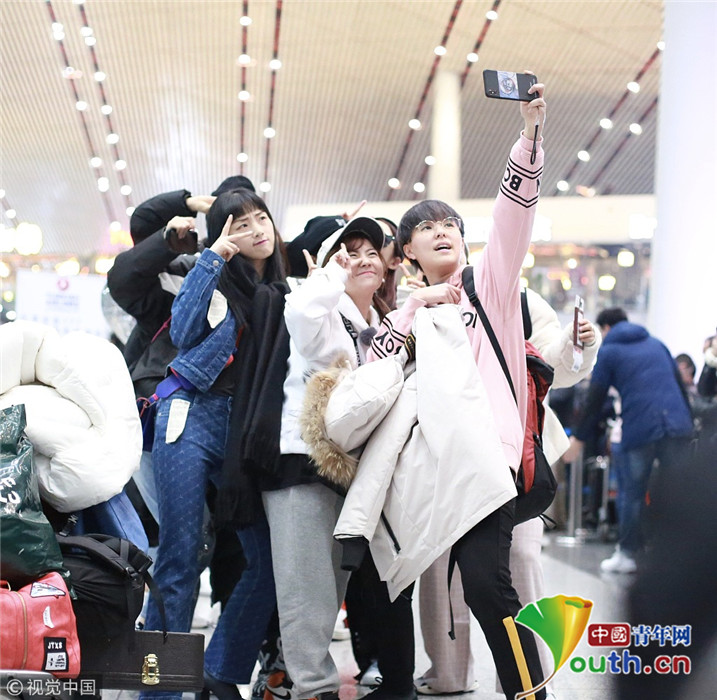 2018年12月3日,北京,“火箭少女101”全體成員現(xiàn)身機(jī)場前往國外錄制團(tuán)總綜。其中孟美岐戴著墨鏡,一身全黑運(yùn)動(dòng)裝扮,大步流星氣場超強(qiáng),楊蕓晴、yamy、楊超越等成員緊隨其后,大家還一起在機(jī)場玩起自拍,好不歡樂。