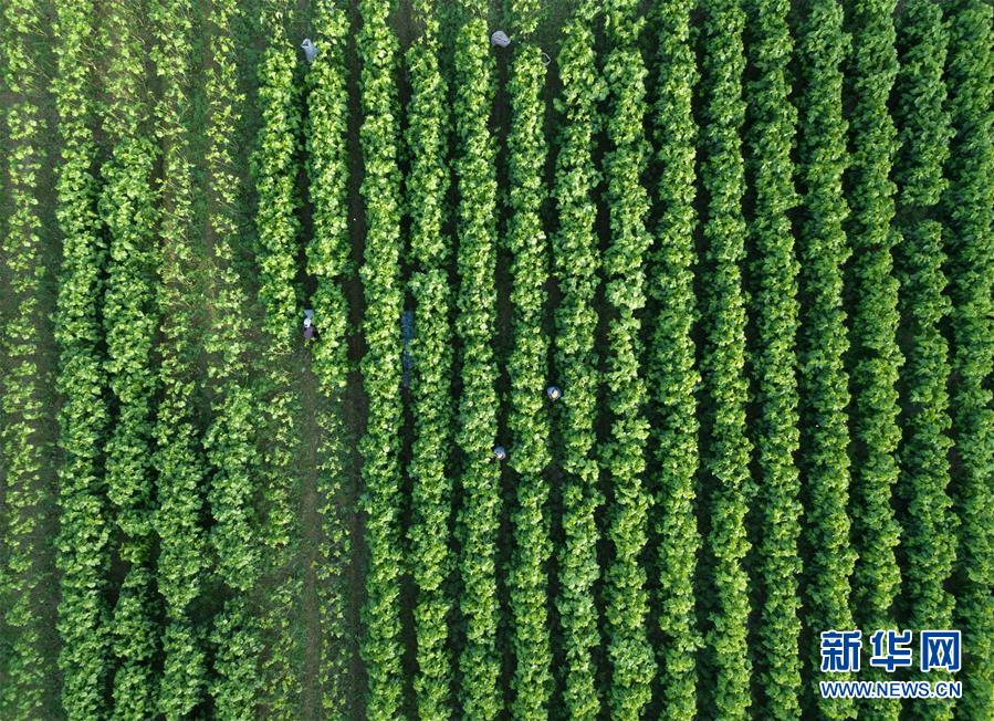 養(yǎng)蠶工人在下姜村采摘桑葉(5月9日無人機拍攝)。