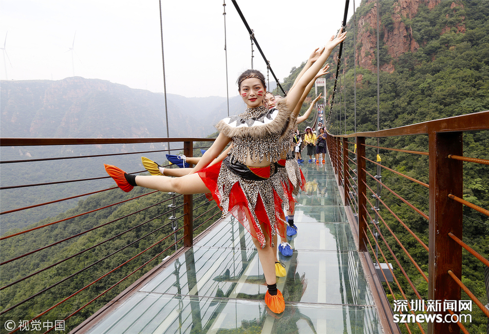 2018年6月30日,鄭州新密一景區(qū)的玻璃吊橋上,幾名美女大學生身穿“野人”服裝練習瑜伽,吸引了眾多游客的圍觀。據(jù)了解,這些大學生來自鄭州。