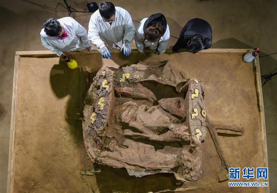 在位于河北行唐的考古實(shí)驗(yàn)室內(nèi),外表裝飾奢華的車(chē)廂(俯視)展露“真容”(12月4日攝)。新華社記者 李賀 攝