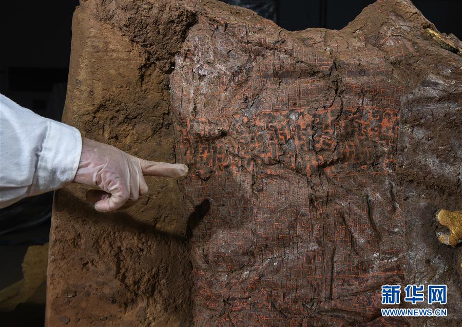 這是在位于河北行唐的考古實(shí)驗(yàn)室內(nèi)拍攝的裝飾有繁復(fù)髤漆彩繪圖案的車(chē)廂遺存(12月4日攝)。新華社記者 李賀 攝