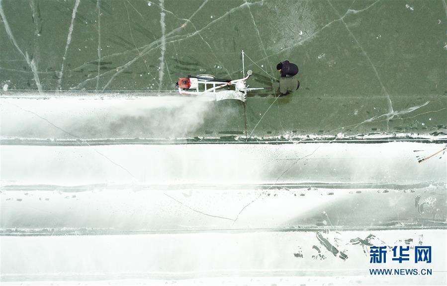在松花江哈爾濱段江面,工人們?cè)谶M(jìn)行切割和采冰工作(12月12日無(wú)人機(jī)拍攝)。 黑龍江哈爾濱市的冰雪主題樂(lè)園哈爾濱冰雪大世界的采冰和建設(shè)工作近日拉開(kāi)帷幕。為保證足夠的優(yōu)質(zhì)冰供給,每天有近千名采冰人和700多輛運(yùn)冰車(chē)參與到采冰工作。 新華社記者 王松 攝