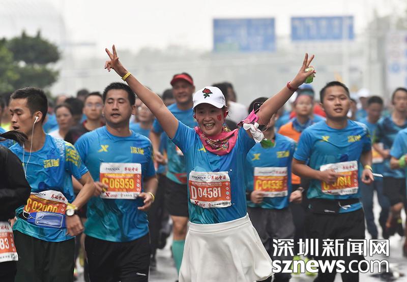 2018年12月16日,深圳國際馬拉松位于后海的折返點(diǎn),即將抵達(dá)終點(diǎn),一名選手?jǐn)[出勝利姿勢。