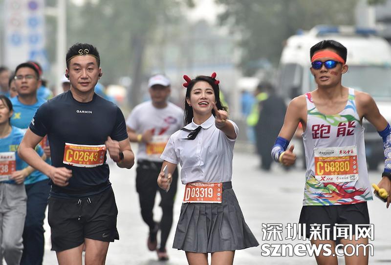 2018年12月16日,深圳國際馬拉松位于后海的折返點,三名選手正在向終點沖刺,跟其他選手不同,其中兩位選手選擇了自己搭配服裝參賽。