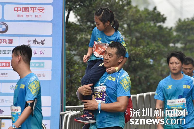 2018年12月16日,本屆馬拉松吸引了不少兒童參加,在深圳國際馬拉松位于后海的折返點(diǎn),一位家長抱著孩子沖刺終點(diǎn)。