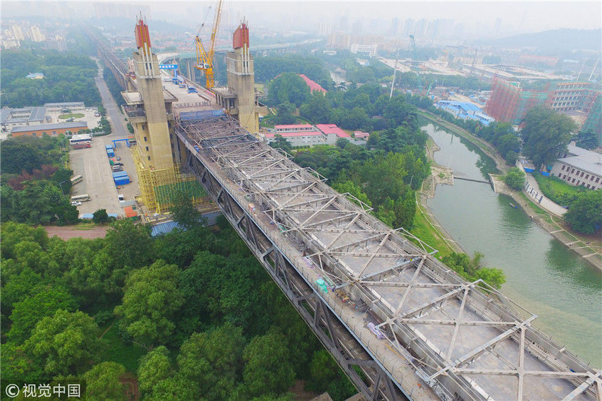 2017年9月19日,南京長江大橋正橋的混凝土面板已經(jīng)全部拆除,僅剩交錯縱橫的鋼桁架橫跨在長江之上,從高空俯瞰猶如一條“鋼鐵巨龍”。
