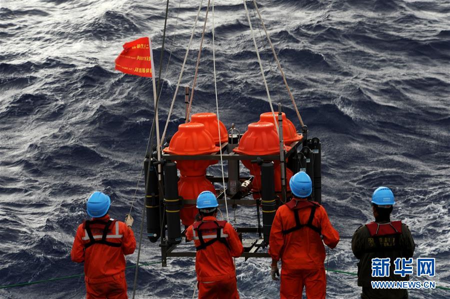 考察隊(duì)員在“沈括”號上布放“彩虹魚”著陸器(12月15日攝)。