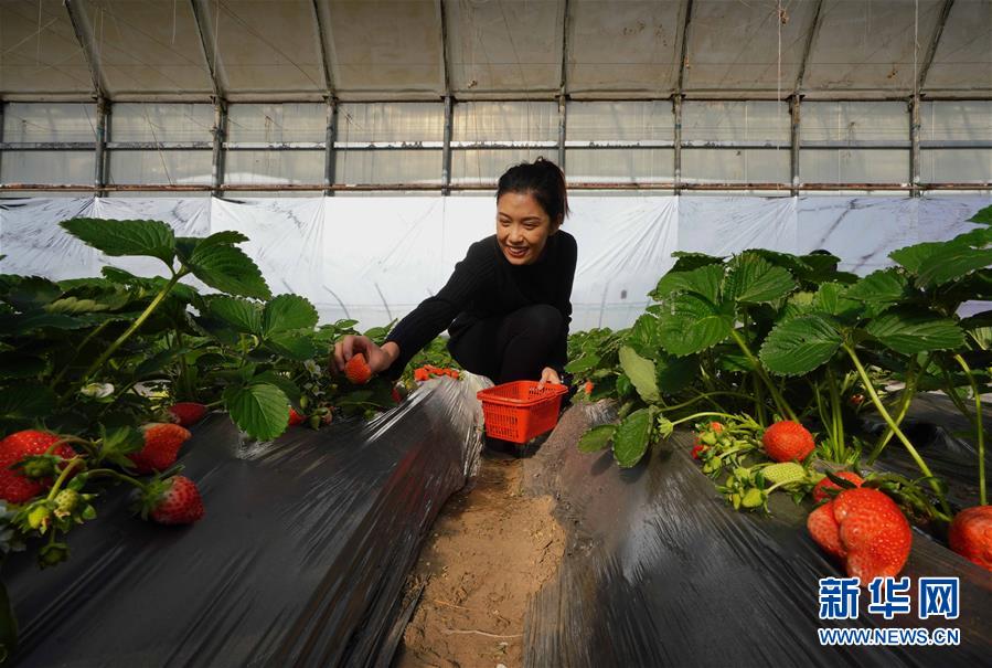 12月15日,游客在唐山市曹妃甸區(qū)一家生態(tài)園的大棚內采摘草莓。 新華社記者 楊世堯 攝