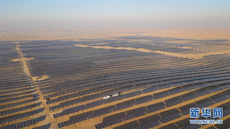 位于庫布其沙漠腹地的達(dá)拉特光伏發(fā)電應(yīng)用領(lǐng)跑基地一期500兆瓦項(xiàng)目(12月13日無人機(jī)拍攝)。 新華社記者 彭源攝