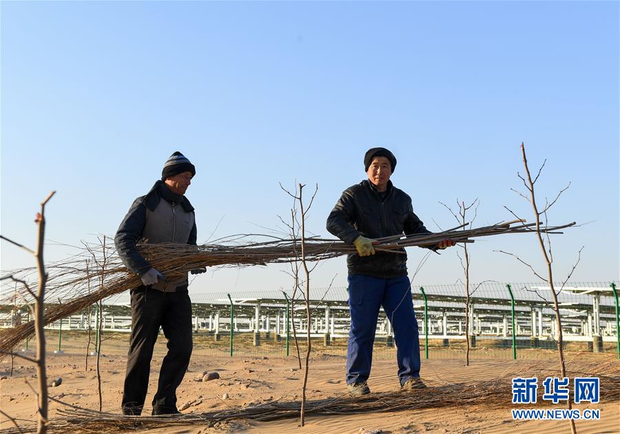 12月13日,位于庫布其沙漠腹地的達(dá)拉特光伏發(fā)電應(yīng)用領(lǐng)跑基地一期500兆瓦項目中,工人用柳枝制作固沙帶。 新華社記者 彭源攝