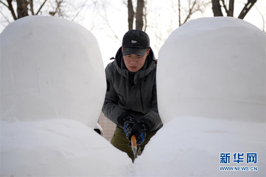 12月17日,雪雕師在松花江畔制作雪雕景觀。新華社記者王凱攝