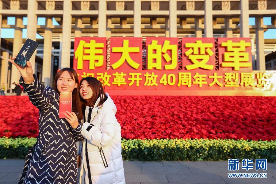 12月18日,參觀者在“偉大的變革——慶祝改革開(kāi)放40周年大型展覽”外自拍留影。 截至當(dāng)日,在中國(guó)國(guó)家博物館舉行的“偉大的變革——慶祝改革開(kāi)放40周年大型展覽”累計(jì)參觀人數(shù)突破160萬(wàn)人次。 新華社記者 張玉薇 攝