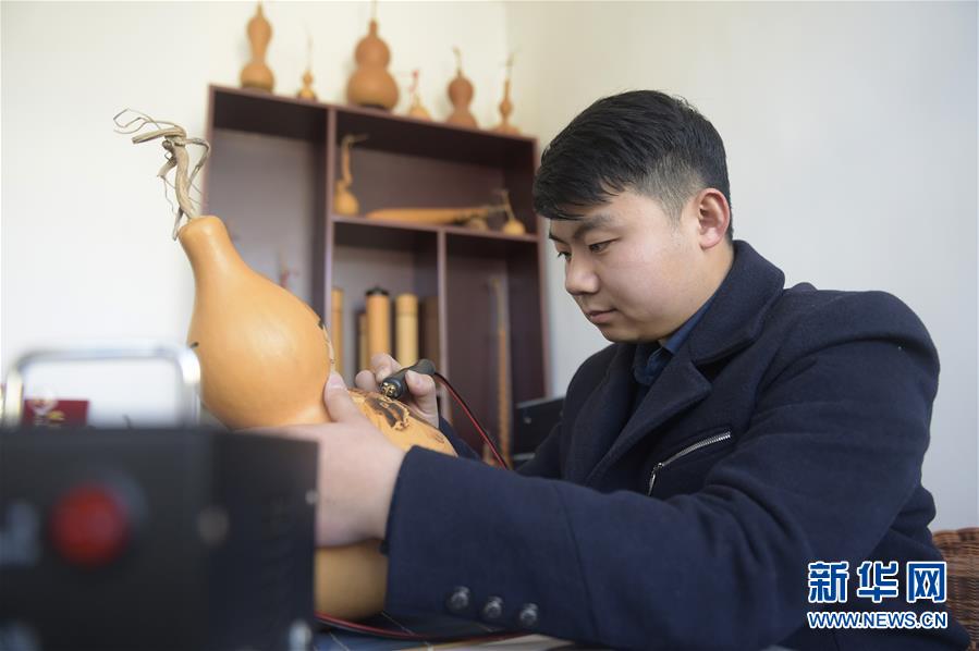 12月18日,劉征在自己的加工坊里進行葫蘆烙畫創(chuàng)作。 新華社記者 魯鵬 攝