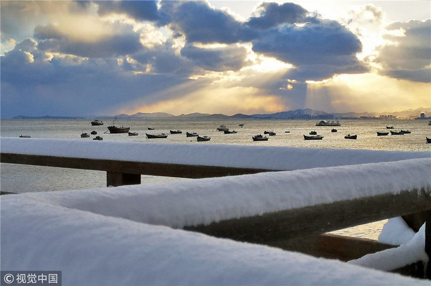 2018年12月7日,山東煙臺,雪后的海濱景色。