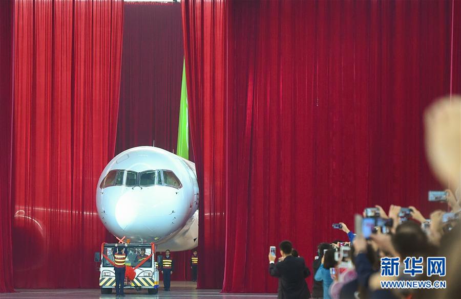 我國(guó)自主研制的C919大型客機(jī)首架機(jī),在中國(guó)商飛公司總裝制造中心浦東基地廠(chǎng)房?jī)?nèi)正式下線(xiàn)(2015年11月2日攝)。新華社發(fā)(裴鑫攝)