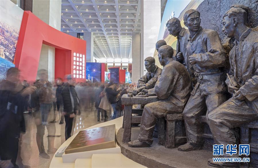11月18日,觀(guān)眾在觀(guān)看安徽小崗村農(nóng)民按下包產(chǎn)到戶(hù)“紅手印”的雕塑(慢門(mén)拍攝)。新華社記者 才揚(yáng) 攝