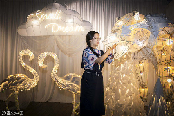 2018年5月6日,廣州,在天河區(qū)一家大商場辦個展時,用紙片做成的北極熊、大松樹、火烈鳥、紙房子在光線的配合下美輪美奐,吸引了很多顧客駐足?!皫缀趺總€人一看到,都會走進那個夢幻的場景里,和這些紙雕一起合影?!眻D片攝于2018年5月6日。