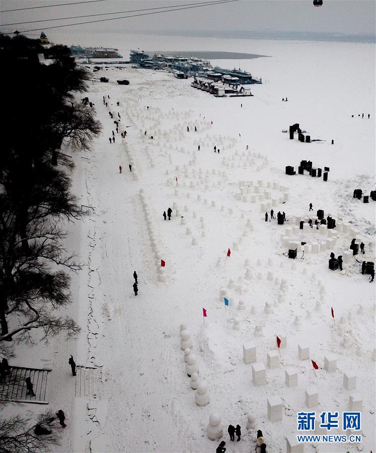 在松花江哈爾濱段江面上,制作中的部分雪人(12月21日無(wú)人機(jī)拍攝)。新華社記者王松攝