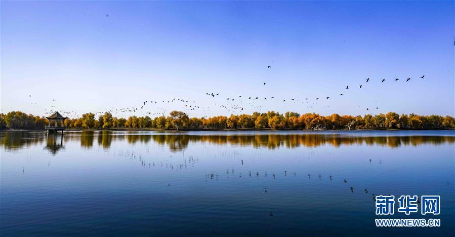 在位于新疆巴音郭楞蒙古自治州輪臺(tái)縣的一處胡楊林,一群鳥(niǎo)從水面上飛過(guò)(10月25日攝)。 在即將過(guò)去的2018年,各地?cái)z影師用鏡頭記錄下四季中國(guó)。大江南北,一幅幅色彩斑斕的美麗畫(huà)卷徐徐展開(kāi)。 新華社記者 趙戈 攝