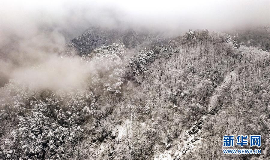 11月8日無人機(jī)拍攝的銀裝素裹的鬼谷嶺國(guó)家森林公園主峰。 新華社記者陶明攝