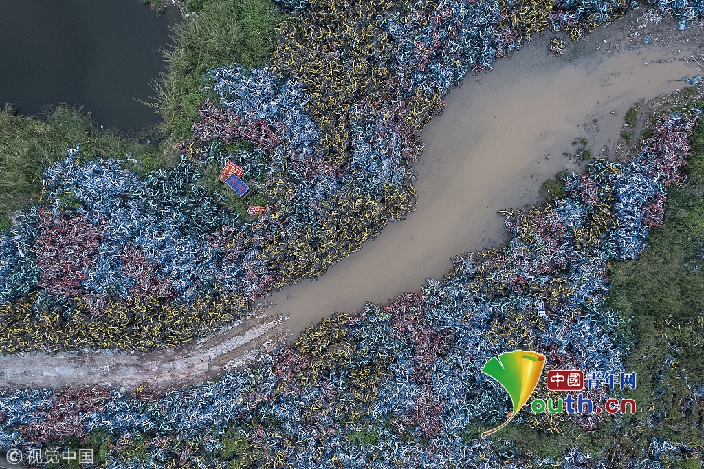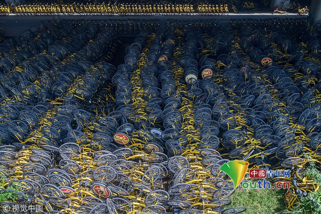 2018年8月24日,西安西咸新區(qū)。連霍高速橋下的ofo小黃車(chē)“墳場(chǎng)”。